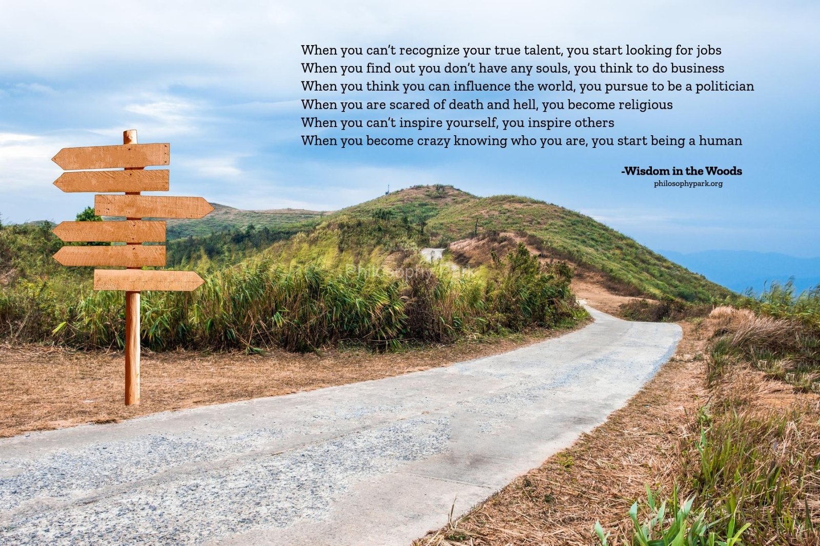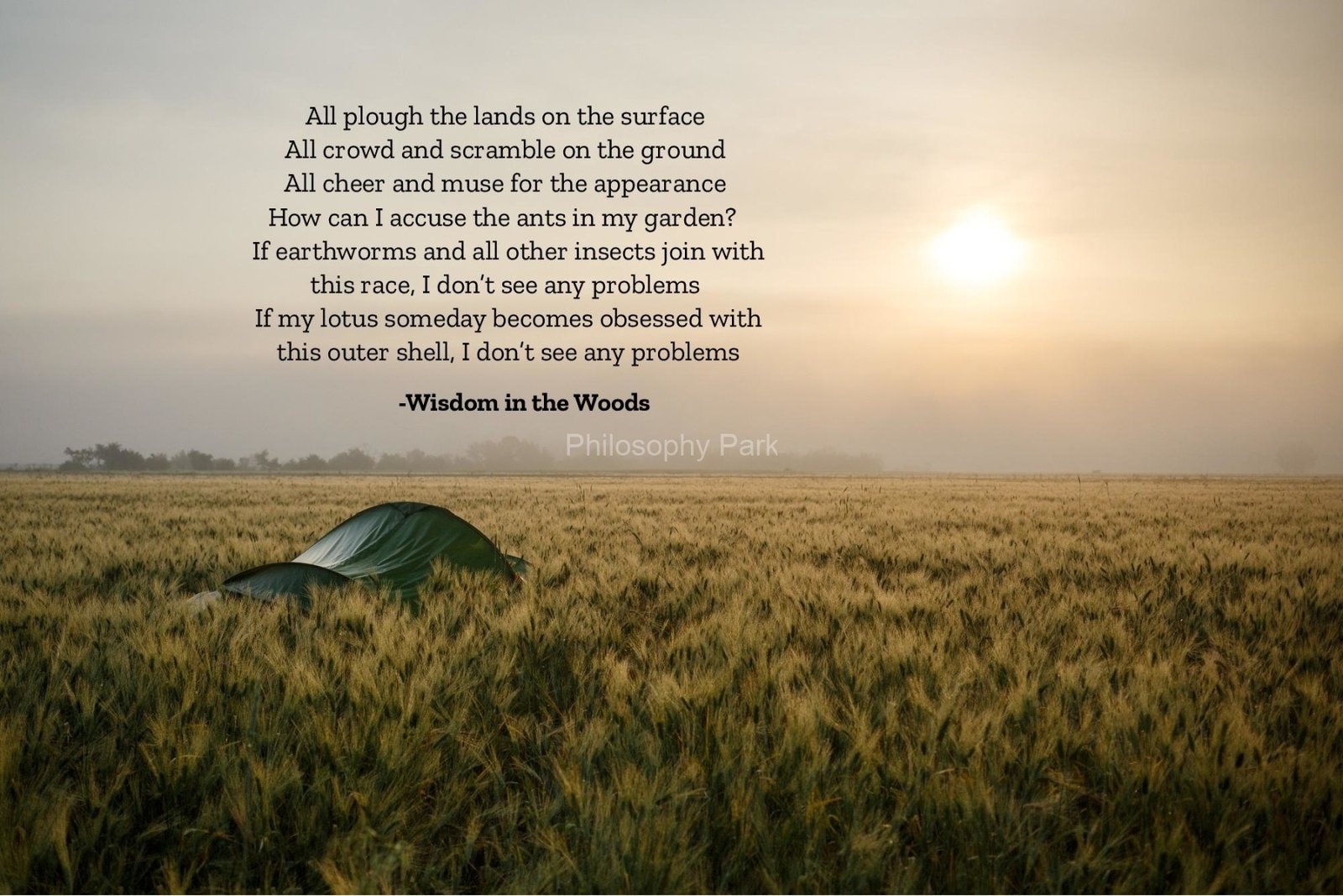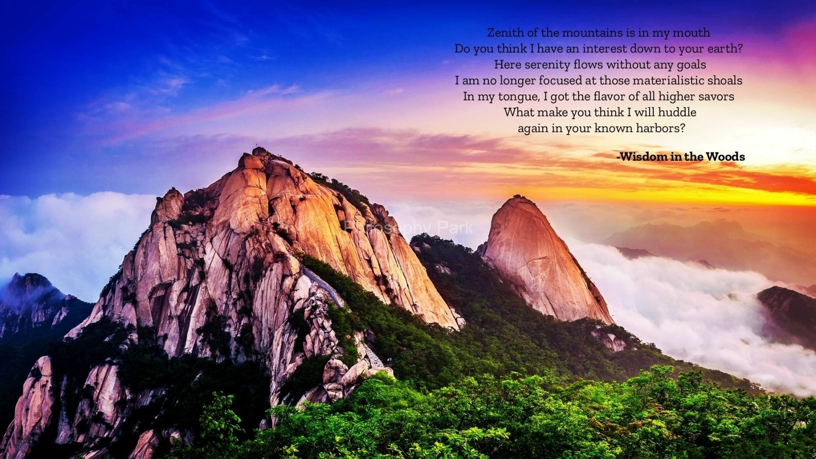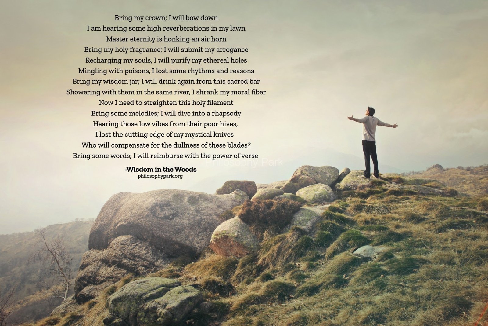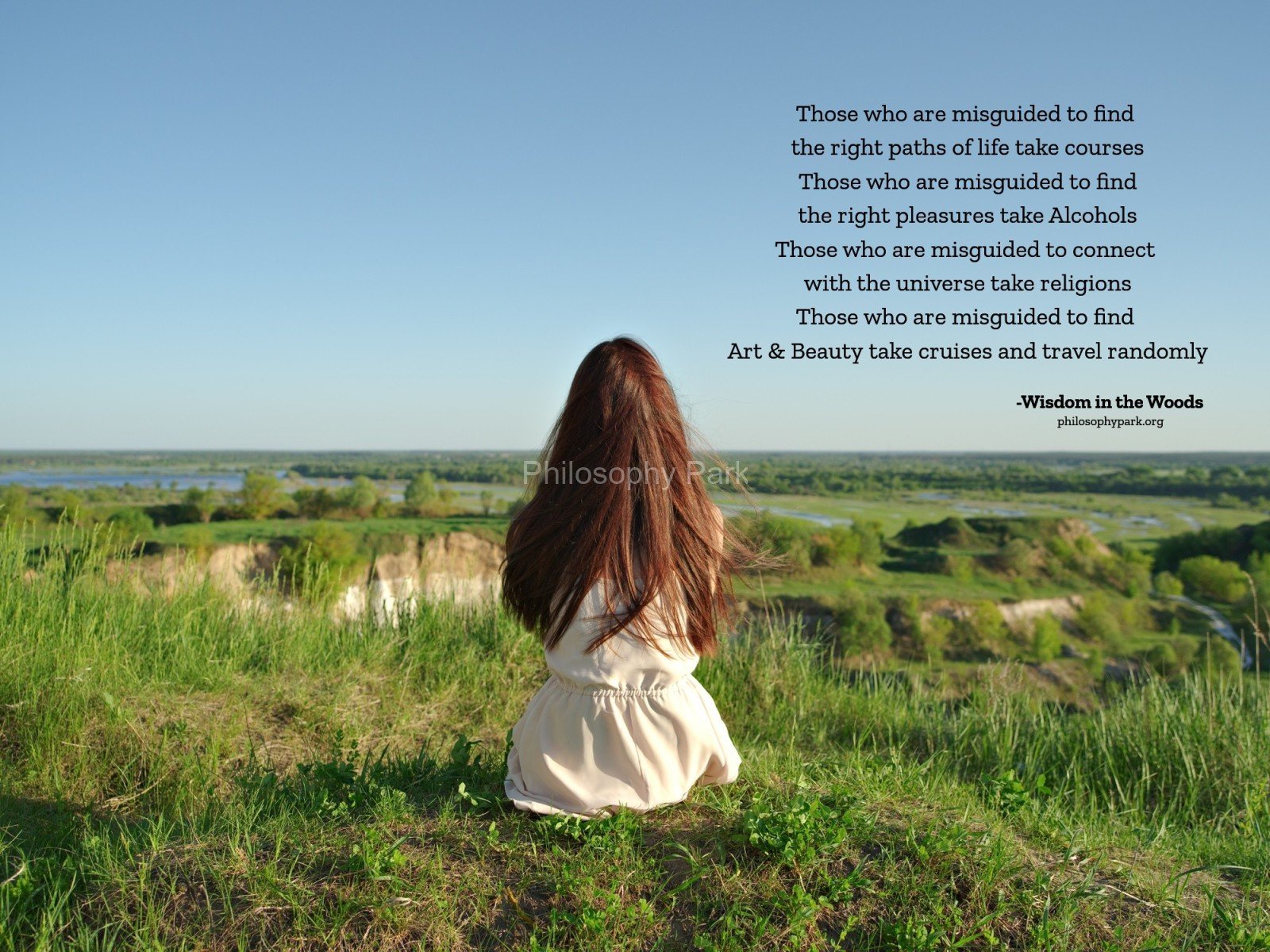 Philosophy Park is a postmodern Practical School of Philosophy based on a series of hands-on doctrines that include living a harmonious and meaningful life with Nature, moderate Science & Technology, Wisdom, Poetry, Music, and Art & Beauty.