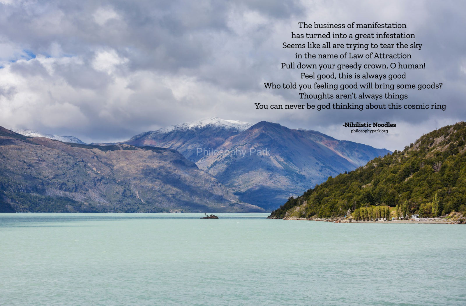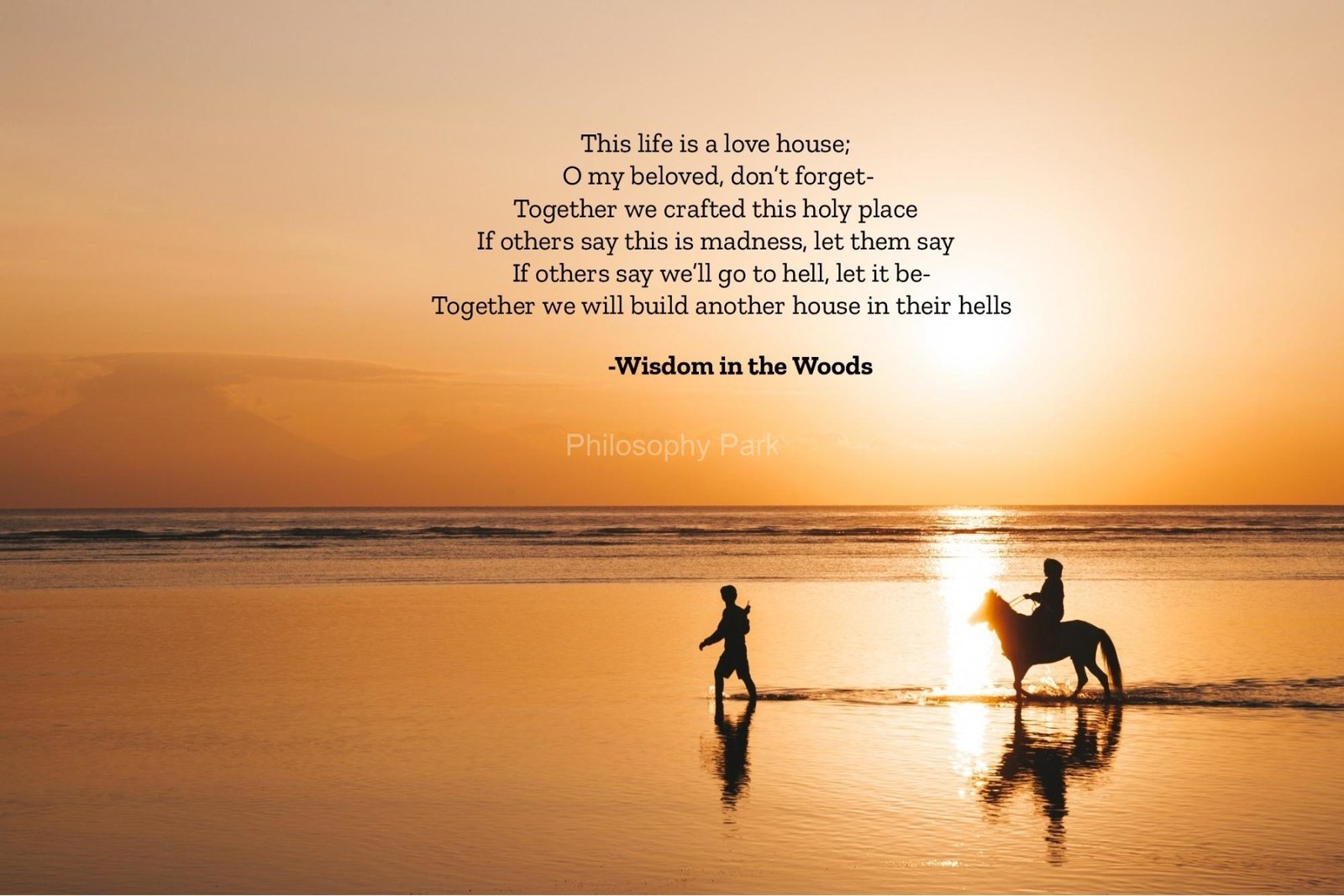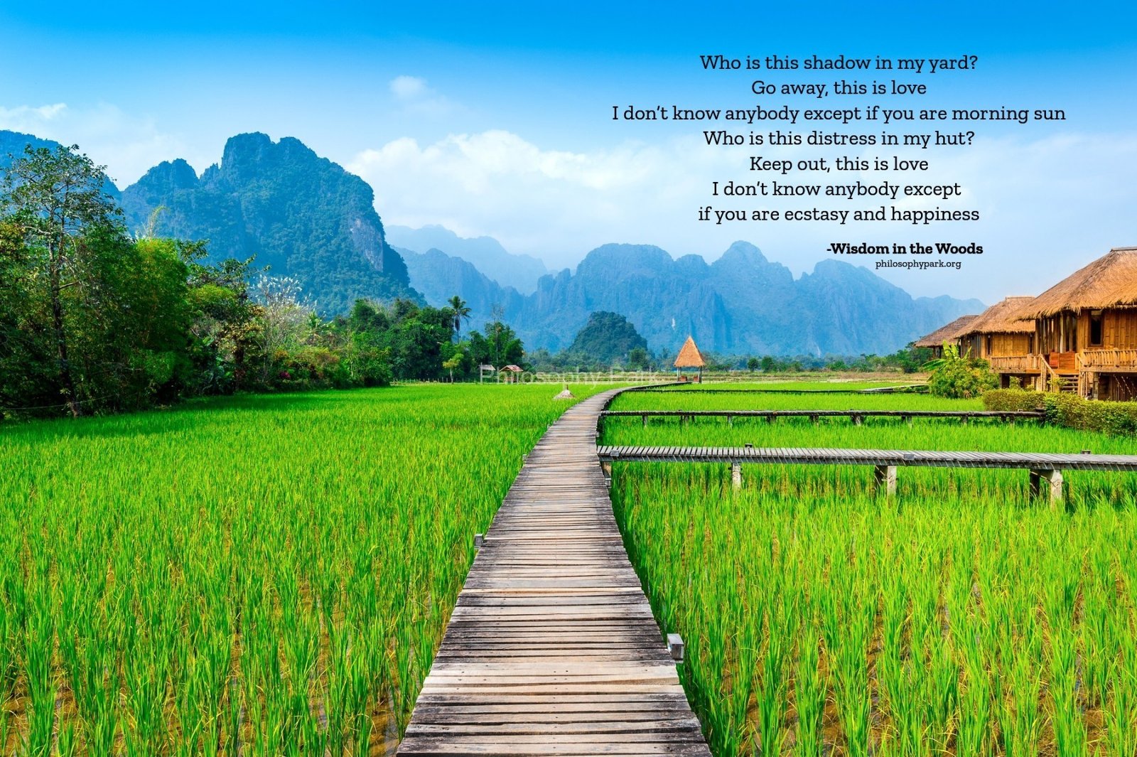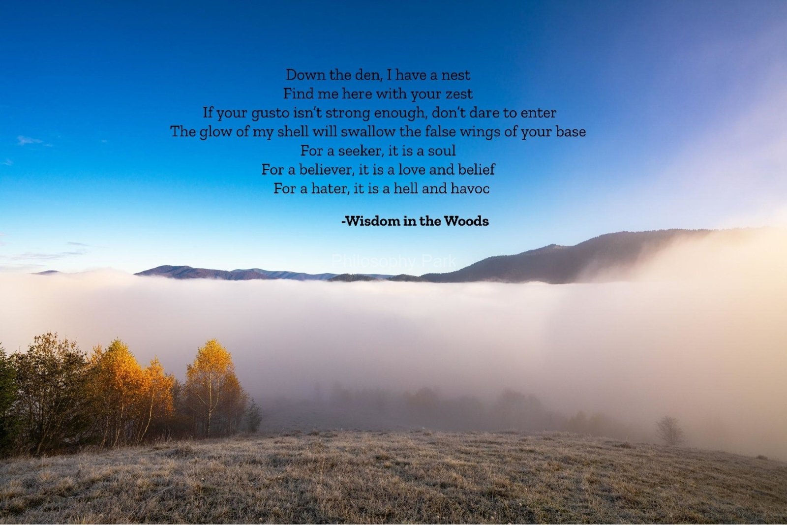 Philosophy Park is a postmodern Practical School of Philosophy based on a series of hands-on doctrines that include living a harmonious and meaningful life with Nature, moderate Science & Technology, Wisdom, Poetry, Music, and Art & Beauty.