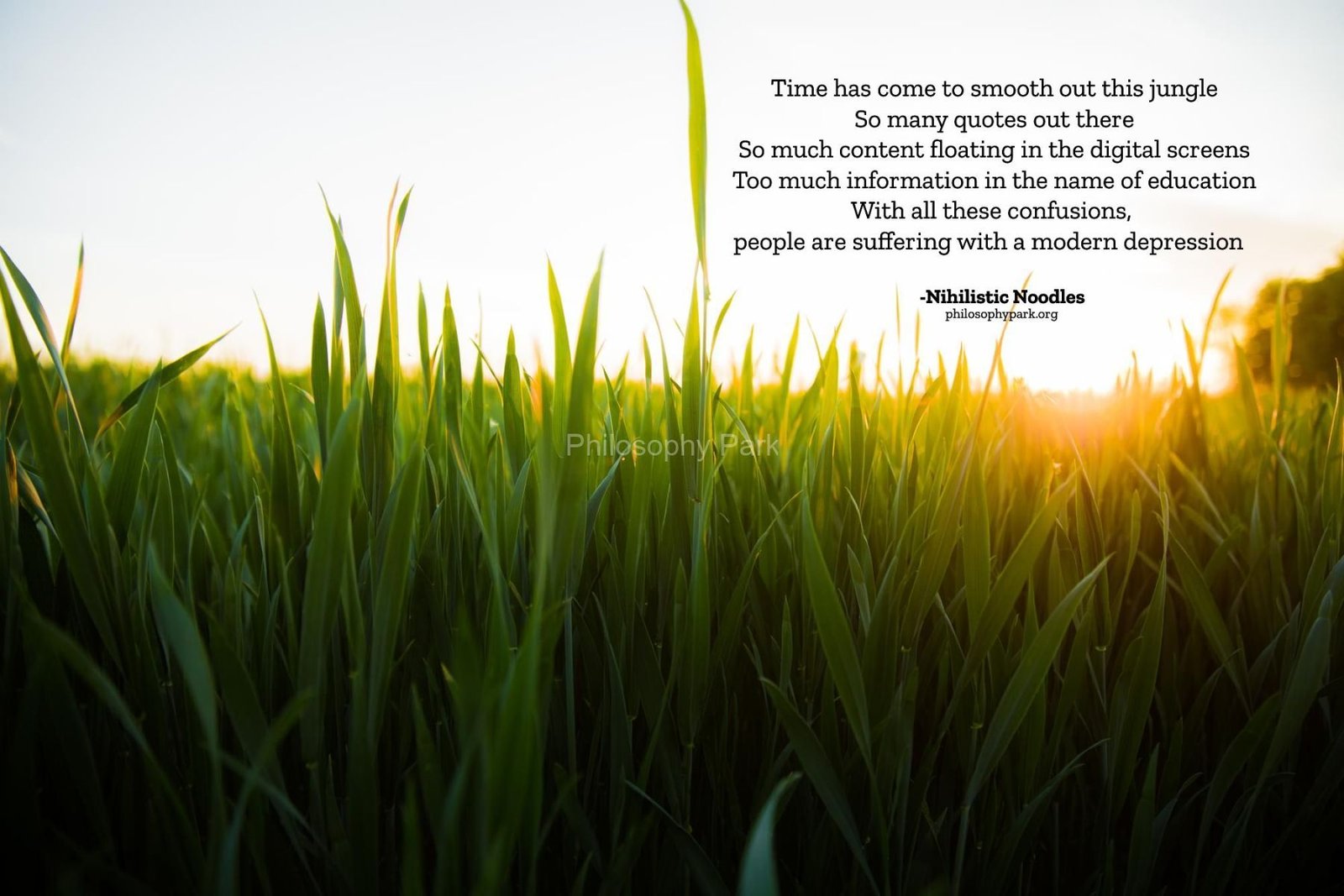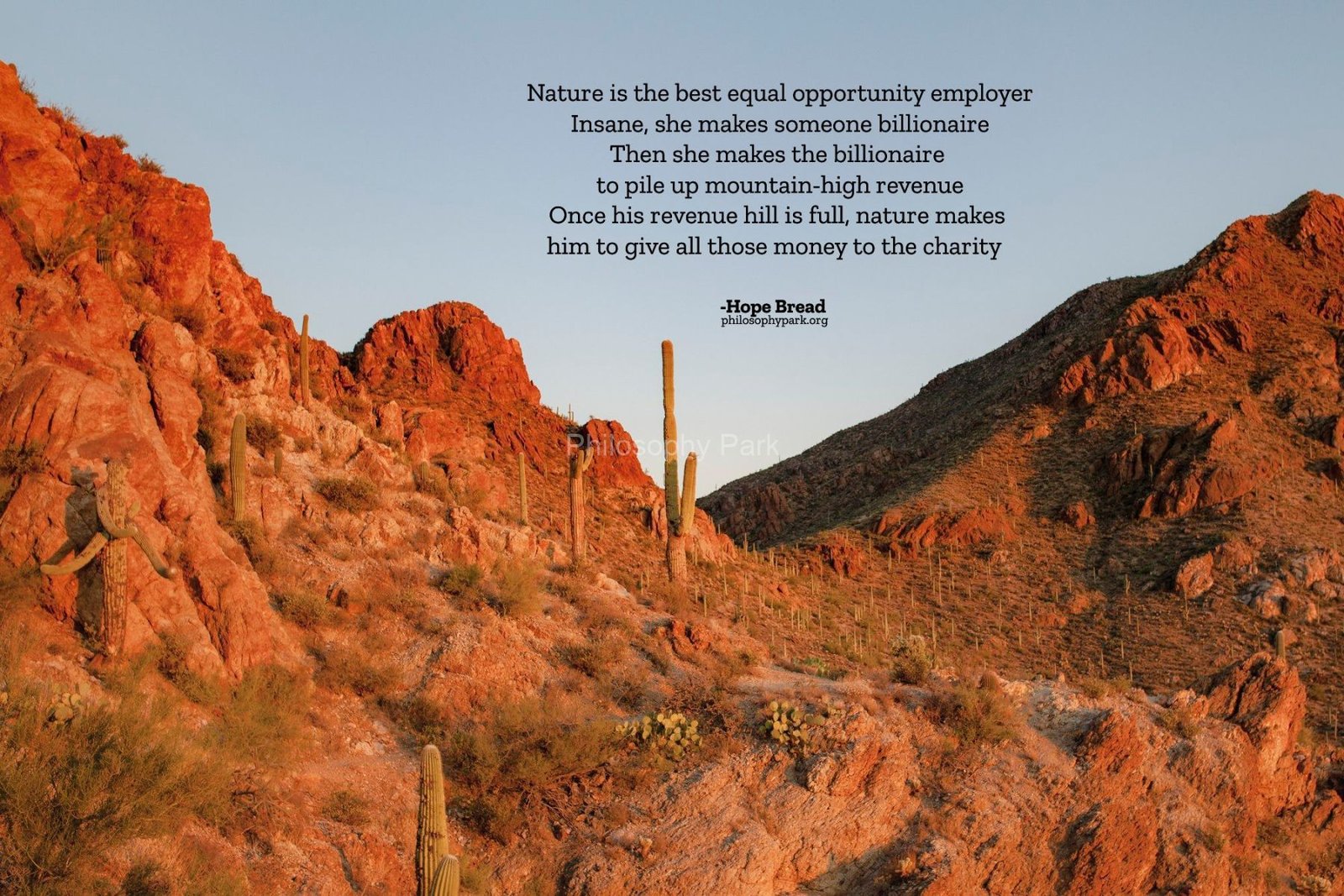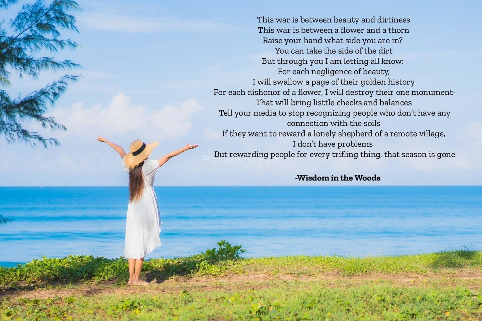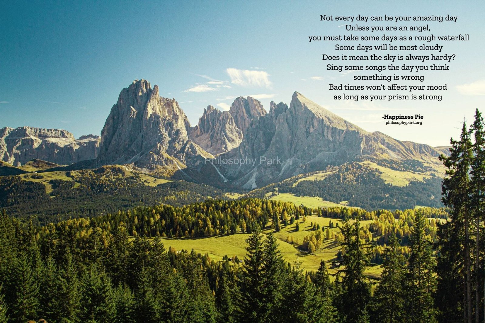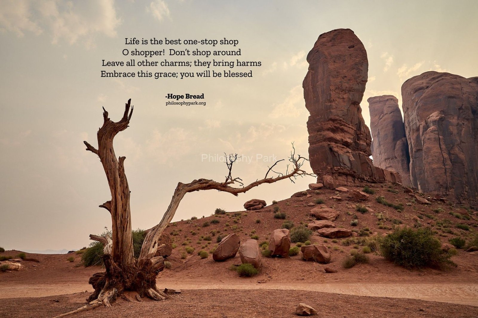 Philosophy Park is a postmodern Practical School of Philosophy based on a series of hands-on doctrines that include living a harmonious and meaningful life with Nature, moderate Science & Technology, Wisdom, Poetry, Music, and Art & Beauty.